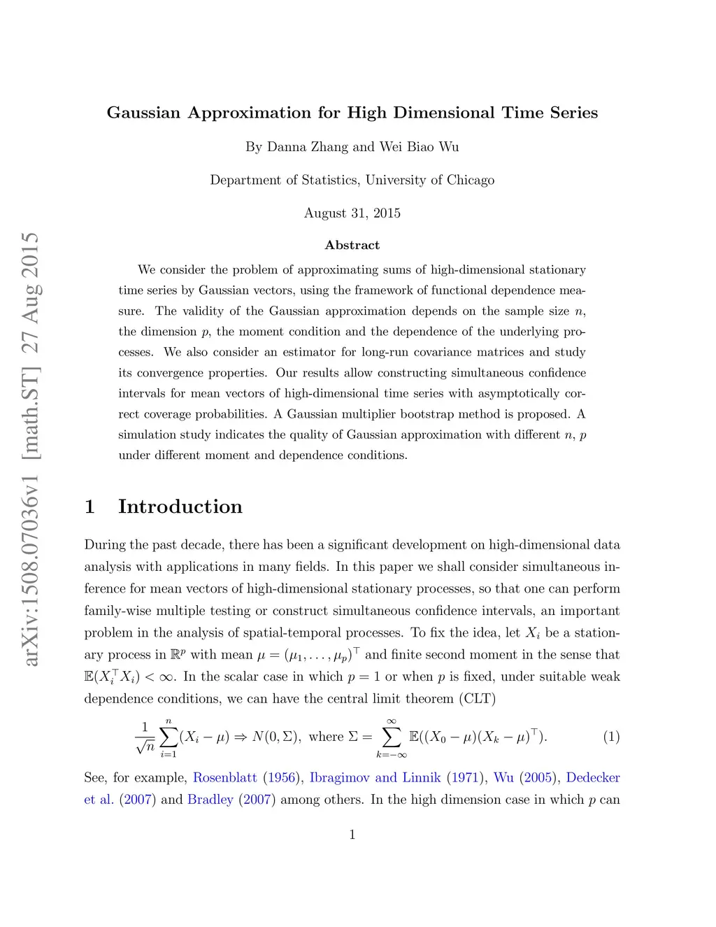 We consider the problem of approximating sums of high-dimensional stationary time series by Gaussian vectors, using the framework of functional dependence measure. The validity of the Gaussian approximation depends on the sample size , the dimension , the moment condition and the dependence of the underlying processes. We also consider an estimator for long-run covariance matrices and study its convergence properties. Our results allow constructing simultaneous confidence intervals for mean vectors of high-dimensional time series with asymptotically correct coverage probabilities. A Gaussian multiplier bootstrap method is proposed. A simulation study indicates the quality of Gaussian approximation with different , under different moment and dependence conditions.