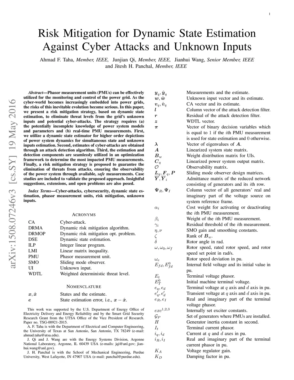 Phasor measurement units (PMUs) can be effectively utilized for the monitoring and control of the power grid. As the cyber-world becomes increasingly embedded into power grids, the risks of this inevitable evolution become serious. In this paper, we present a risk mitigation strategy, based on dynamic state estimation, to eliminate threat levels from the grid's unknown inputs and potential attack vectors. The strategy requires (a) the potentially incomplete knowledge of power system models and parameters and (b) real-time PMU measurements. First, we utilize state-of-the-art dynamic state estimators, representing the higher order depictions of linearized, small-signal model or nonlinear representations of the power system dynamics for state- and unknown inputs estimation. Second, estimates of potential attack vectors are obtained through an attack detection algorithm. Third, the estimation and detection components are seamlessly utilized in an optimization framework to determine the PMU measurements under cyber-attacks. Finally, a risk mitigation strategy is employed to guarantee the elimination of threats from attacks, ensuring the observability of the power system through available safe measurements. Numerical results on a 16-machine 68-bus system are included to illustrate the effectiveness of the proposed approach. Insightful suggestions, extensions, and open research problems are also posed.