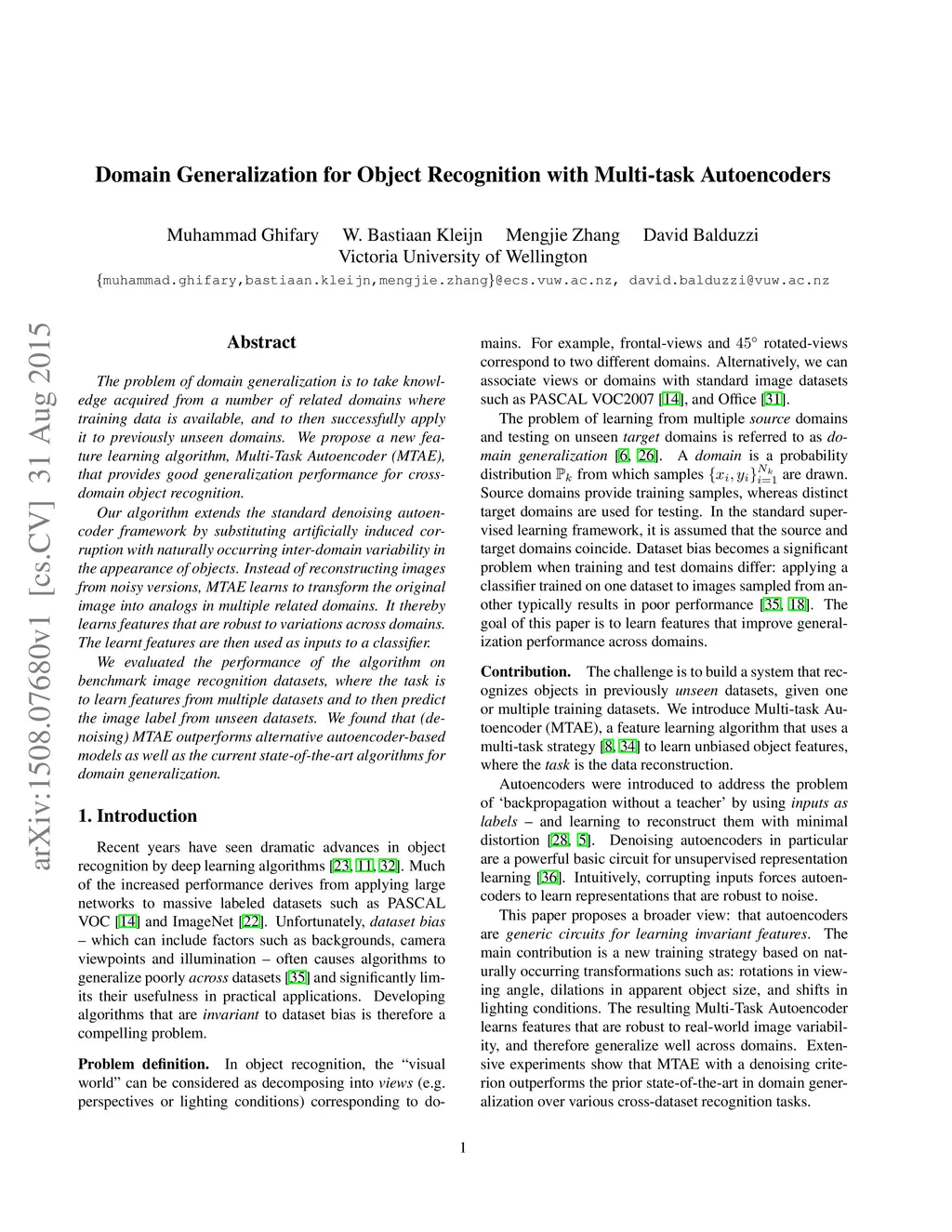 The problem of domain generalization is to take knowledge acquired from a number of related domains where training data is available, and to then successfully apply it to previously unseen domains. We propose a new feature learning algorithm, Multi-Task Autoencoder (MTAE), that provides good generalization performance for cross-domain object recognition. Our algorithm extends the standard denoising autoencoder framework by substituting artificially induced corruption with naturally occurring inter-domain variability in the appearance of objects. Instead of reconstructing images from noisy versions, MTAE learns to transform the original image into analogs in multiple related domains. It thereby learns features that are robust to variations across domains. The learnt features are then used as inputs to a classifier. We evaluated the performance of the algorithm on benchmark image recognition datasets, where the task is to learn features from multiple datasets and to then predict the image label from unseen datasets. We found that (denoising) MTAE outperforms alternative autoencoder-based models as well as the current state-of-the-art algorithms for domain generalization.