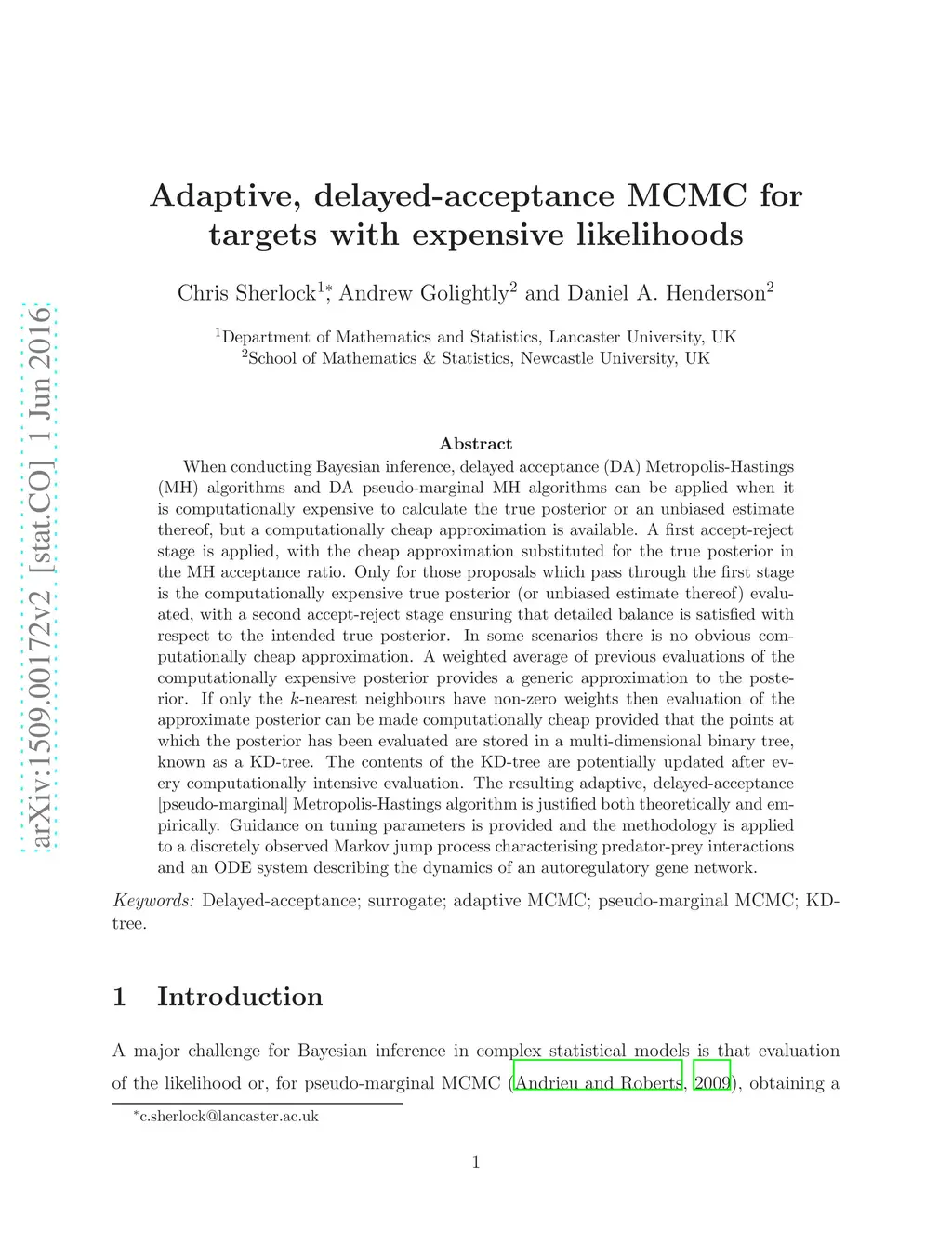 When conducting Bayesian inference, delayed acceptance (DA) Metropolis-Hastings (MH) algorithms and DA pseudo-marginal MH algorithms can be applied when it is computationally expensive to calculate the true posterior or an unbiased estimate thereof, but a computationally cheap approximation is available. A first accept-reject stage is applied, with the cheap approximation substituted for the true posterior in the MH acceptance ratio. Only for those proposals which pass through the first stage is the computationally expensive true posterior (or unbiased estimate thereof) evaluated, with a second accept-reject stage ensuring that detailed balance is satisfied with respect to the intended true posterior. In some scenarios there is no obvious computationally cheap approximation. A weighted average of previous evaluations of the computationally expensive posterior provides a generic approximation to the posterior. If only the -nearest neighbours have non-zero weights then evaluation of the approximate posterior can be made computationally cheap provided that the points at which the posterior has been evaluated are stored in a multi-dimensional binary tree, known as a KD-tree. The contents of the KD-tree are potentially updated after every computationally intensive evaluation. The resulting adaptive, delayed-acceptance [pseudo-marginal] Metropolis-Hastings algorithm is justified both theoretically and empirically. Guidance on tuning parameters is provided and the methodology is applied to a discretely observed Markov jump process characterising predator-prey interactions and an ODE system describing the dynamics of an autoregulatory gene network.