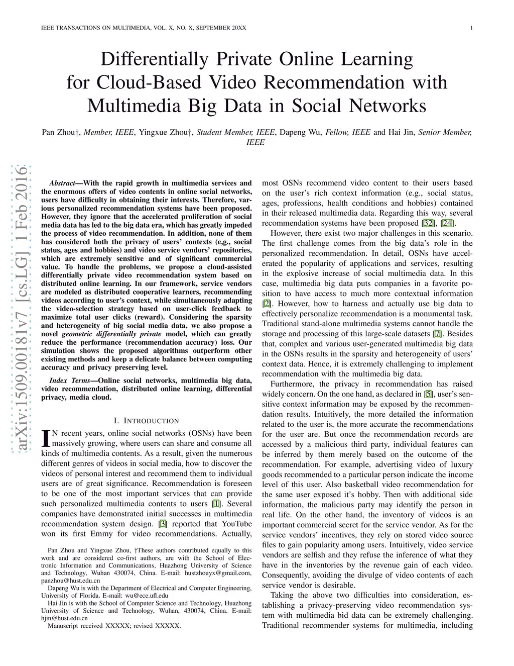 With the rapid growth in multimedia services and the enormous offers of video contents in online social networks, users have difficulty in obtaining their interests. Therefore, various personalized recommendation systems have been proposed. However, they ignore that the accelerated proliferation of social media data has led to the big data era, which has greatly impeded the process of video recommendation. In addition, none of them has considered both the privacy of users' contexts (e,g., social status, ages and hobbies) and video service vendors' repositories, which are extremely sensitive and of significant commercial value. To handle the problems, we propose a cloud-assisted differentially private video recommendation system based on distributed online learning. In our framework, service vendors are modeled as distributed cooperative learners, recommending videos according to user's context, while simultaneously adapting the video-selection strategy based on user-click feedback to maximize total user clicks (reward). Considering the sparsity and heterogeneity of big social media data, we also propose a novel geometric differentially private model, which can greatly reduce the performance (recommendation accuracy) loss. Our simulation shows the proposed algorithms outperform other existing methods and keep a delicate balance between computing accuracy and privacy preserving level.