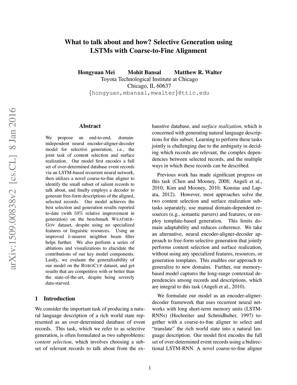 We propose an end-to-end, domain-independent neural encoder-aligner-decoder model for selective generation, i.e., the joint task of content selection and surface realization. Our model first encodes a full set of over-determined database event records via an LSTM-based recurrent neural network, then utilizes a novel coarse-to-fine aligner to identify the small subset of salient records to talk about, and finally employs a decoder to generate free-form descriptions of the aligned, selected records. Our model achieves the best selection and generation results reported to-date (with 59% relative improvement in generation) on the benchmark WeatherGov dataset, despite using no specialized features or linguistic resources. Using an improved k-nearest neighbor beam filter helps further. We also perform a series of ablations and visualizations to elucidate the contributions of our key model components. Lastly, we evaluate the generalizability of our model on the RoboCup dataset, and get results that are competitive with or better than the state-of-the-art, despite being severely data-starved.