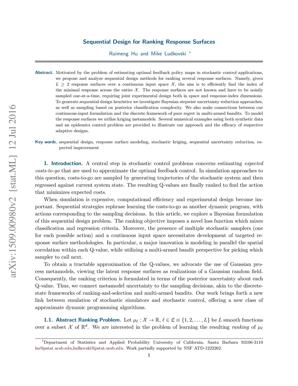 We propose and analyze sequential design methods for the problem of ranking several response surfaces. Namely, given response surfaces over a continuous input space , the aim is to efficiently find the index of the minimal response across the entire . The response surfaces are not known and have to be noisily sampled one-at-a-time. This setting is motivated by stochastic control applications and requires joint experimental design both in space and response-index dimensions. To generate sequential design heuristics we investigate stepwise uncertainty reduction approaches, as well as sampling based on posterior classification complexity. We also make connections between our continuous-input formulation and the discrete framework of pure regret in multi-armed bandits. To model the response surfaces we utilize kriging surrogates. Several numerical examples using both synthetic data and an epidemics control problem are provided to illustrate our approach and the efficacy of respective adaptive designs.
