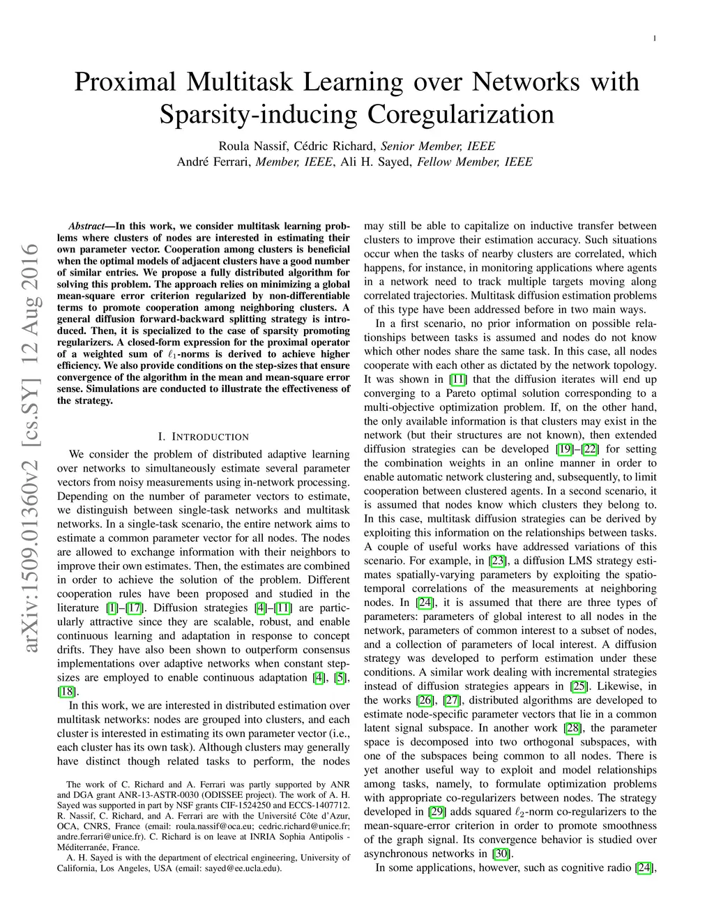 In this work, we consider multitask learning problems where clusters of nodes are interested in estimating their own parameter vector. Cooperation among clusters is beneficial when the optimal models of adjacent clusters have a good number of similar entries. We propose a fully distributed algorithm for solving this problem. The approach relies on minimizing a global mean-square error criterion regularized by non-differentiable terms to promote cooperation among neighboring clusters. A general diffusion forward-backward splitting strategy is introduced. Then, it is specialized to the case of sparsity promoting regularizers. A closed-form expression for the proximal operator of a weighted sum of -norms is derived to achieve higher efficiency. We also provide conditions on the step-sizes that ensure convergence of the algorithm in the mean and mean-square error sense. Simulations are conducted to illustrate the effectiveness of the strategy.
