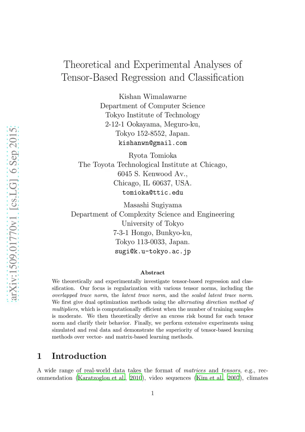 We theoretically and experimentally investigate tensor-based regression and classification. Our focus is regularization with various tensor norms, including the overlapped trace norm, the latent trace norm, and the scaled latent trace norm. We first give dual optimization methods using the alternating direction method of multipliers, which is computationally efficient when the number of training samples is moderate. We then theoretically derive an excess risk bound for each tensor norm and clarify their behavior. Finally, we perform extensive experiments using simulated and real data and demonstrate the superiority of tensor-based learning methods over vector- and matrix-based learning methods.