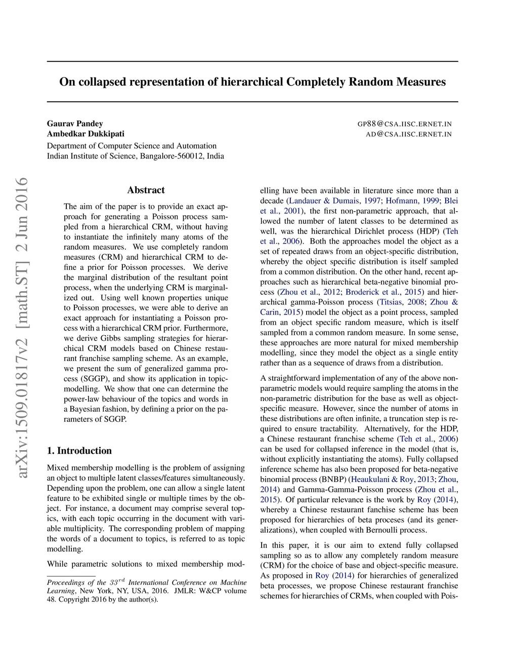 On collapsed representation of hierarchical Completely Random Measures