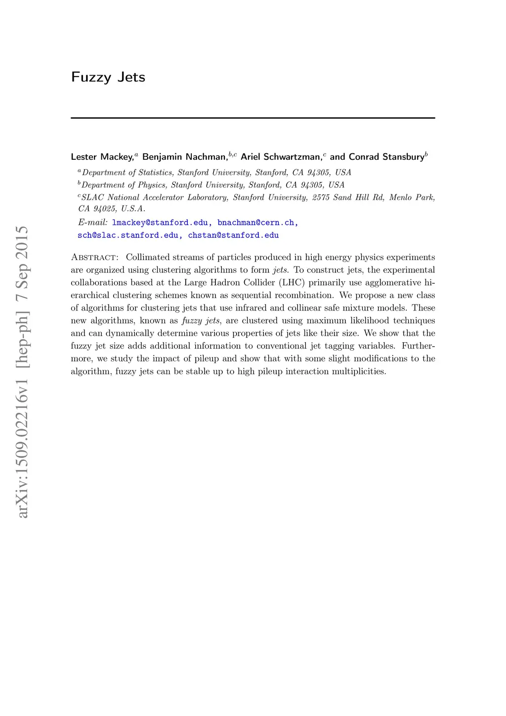 Collimated streams of particles produced in high energy physics experiments are organized using clustering algorithms to form jets. To construct jets, the experimental collaborations based at the Large Hadron Collider (LHC) primarily use agglomerative hierarchical clustering schemes known as sequential recombination. We propose a new class of algorithms for clustering jets that use infrared and collinear safe mixture models. These new algorithms, known as fuzzy jets, are clustered using maximum likelihood techniques and can dynamically determine various properties of jets like their size. We show that the fuzzy jet size adds additional information to conventional jet tagging variables. Furthermore, we study the impact of pileup and show that with some slight modifications to the algorithm, fuzzy jets can be stable up to high pileup interaction multiplicities.