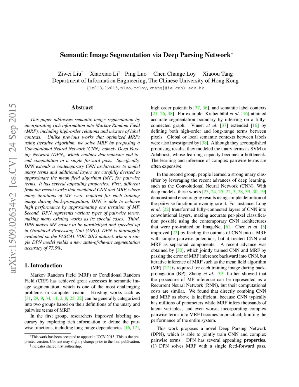 This paper addresses semantic image segmentation by incorporating rich information into Markov Random Field (MRF), including high-order relations and mixture of label contexts. Unlike previous works that optimized MRFs using iterative algorithm, we solve MRF by proposing a Convolutional Neural Network (CNN), namely Deep Parsing Network (DPN), which enables deterministic end-to-end computation in a single forward pass. Specifically, DPN extends a contemporary CNN architecture to model unary terms and additional layers are carefully devised to approximate the mean field algorithm (MF) for pairwise terms. It has several appealing properties. First, different from the recent works that combined CNN and MRF, where many iterations of MF were required for each training image during back-propagation, DPN is able to achieve high performance by approximating one iteration of MF. Second, DPN represents various types of pairwise terms, making many existing works as its special cases. Third, DPN makes MF easier to be parallelized and speeded up in Graphical Processing Unit (GPU). DPN is thoroughly evaluated on the PASCAL VOC 2012 dataset, where a single DPN model yields a new state-of-the-art segmentation accuracy.