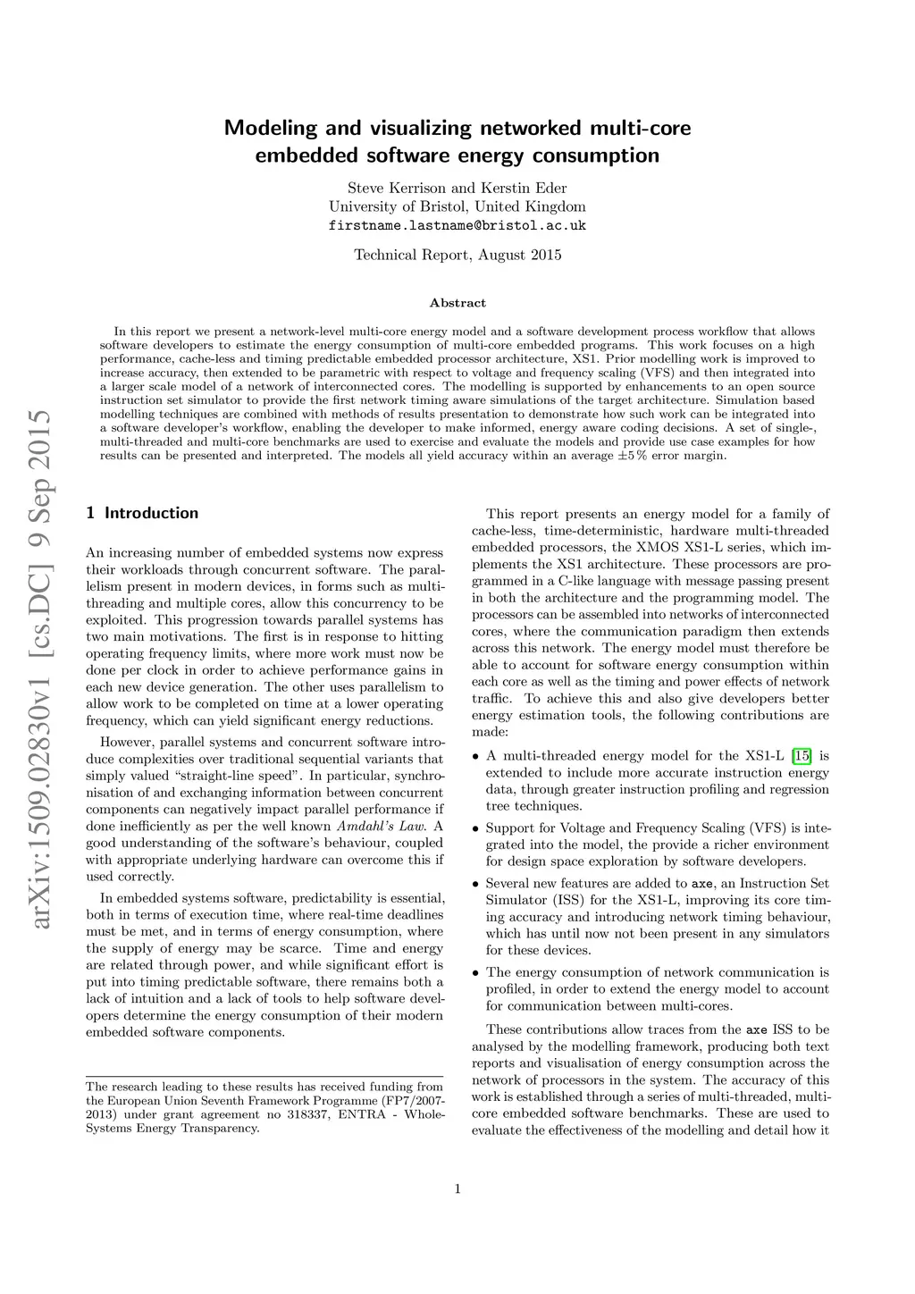 In this report we present a network-level multi-core energy model and a software development process workflow that allows software developers to estimate the energy consumption of multi-core embedded programs. This work focuses on a high performance, cache-less and timing predictable embedded processor architecture, XS1. Prior modelling work is improved to increase accuracy, then extended to be parametric with respect to voltage and frequency scaling (VFS) and then integrated into a larger scale model of a network of interconnected cores. The modelling is supported by enhancements to an open source instruction set simulator to provide the first network timing aware simulations of the target architecture. Simulation based modelling techniques are combined with methods of results presentation to demonstrate how such work can be integrated into a software developer's workflow, enabling the developer to make informed, energy aware coding decisions. A set of single-, multi-threaded and multi-core benchmarks are used to exercise and evaluate the models and provide use case examples for how results can be presented and interpreted. The models all yield accuracy within an average +/-5 % error margin.