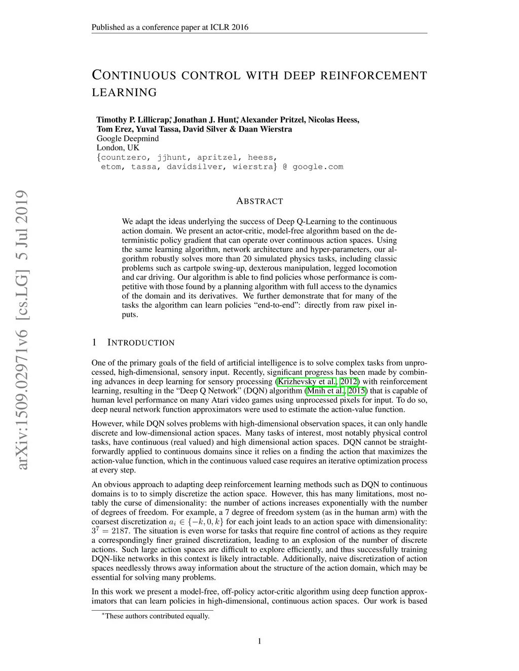 We adapt the ideas underlying the success of Deep Q-Learning to the continuous action domain. We present an actor-critic, model-free algorithm based on the deterministic policy gradient that can operate over continuous action spaces. Using the same learning algorithm, network architecture and hyper-parameters, our algorithm robustly solves more than 20 simulated physics tasks, including classic problems such as cartpole swing-up, dexterous manipulation, legged locomotion and car driving. Our algorithm is able to find policies whose performance is competitive with those found by a planning algorithm with full access to the dynamics of the domain and its derivatives. We further demonstrate that for many of the tasks the algorithm can learn policies end-to-end: directly from raw pixel inputs.