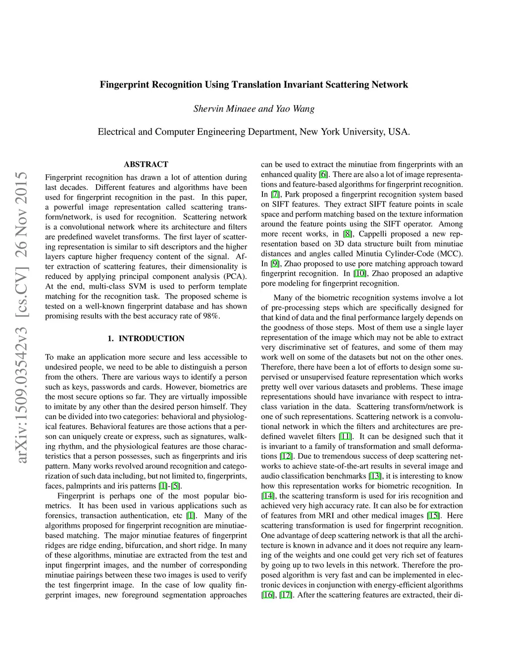 Fingerprint Recognition Using Translation Invariant Scattering Network