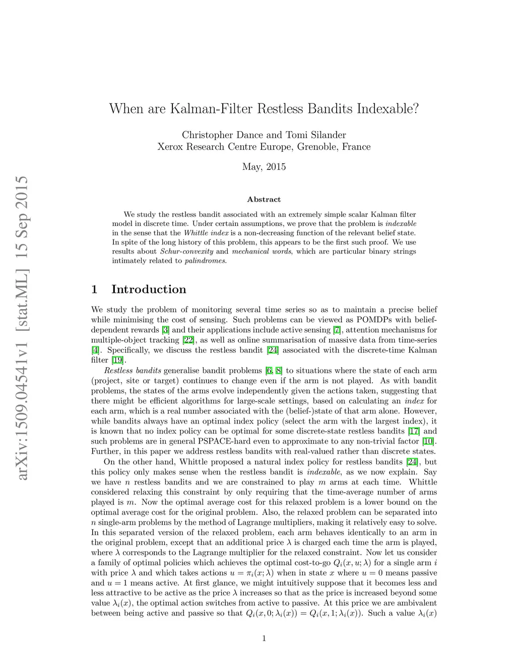 We study the restless bandit associated with an extremely simple scalar Kalman filter model in discrete time. Under certain assumptions, we prove that the problem is indexable in the sense that the Whittle index is a non-decreasing function of the relevant belief state. In spite of the long history of this problem, this appears to be the first such proof. We use results about Schur-convexity and mechanical words, which are particular binary strings intimately related to palindromes.