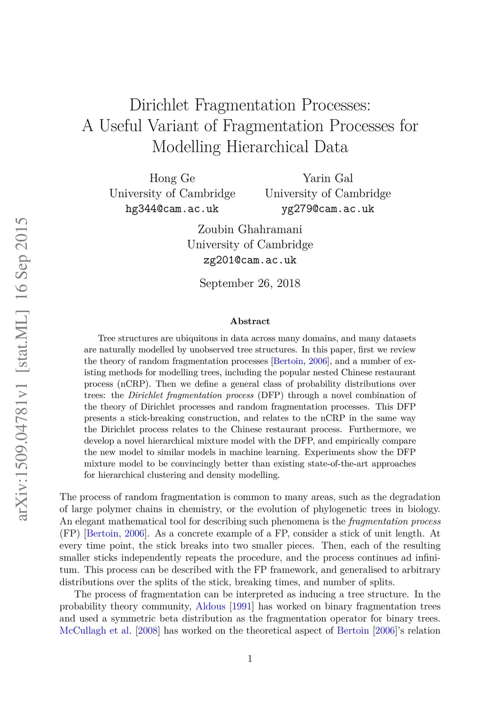 Tree structures are ubiquitous in data across many domains, and many datasets are naturally modelled by unobserved tree structures. In this paper, first we review the theory of random fragmentation processes [Bertoin, 2006], and a number of existing methods for modelling trees, including the popular nested Chinese restaurant process (nCRP). Then we define a general class of probability distributions over trees: the Dirichlet fragmentation process (DFP) through a novel combination of the theory of Dirichlet processes and random fragmentation processes. This DFP presents a stick-breaking construction, and relates to the nCRP in the same way the Dirichlet process relates to the Chinese restaurant process. Furthermore, we develop a novel hierarchical mixture model with the DFP, and empirically compare the new model to similar models in machine learning. Experiments show the DFP mixture model to be convincingly better than existing state-of-the-art approaches for hierarchical clustering and density modelling.