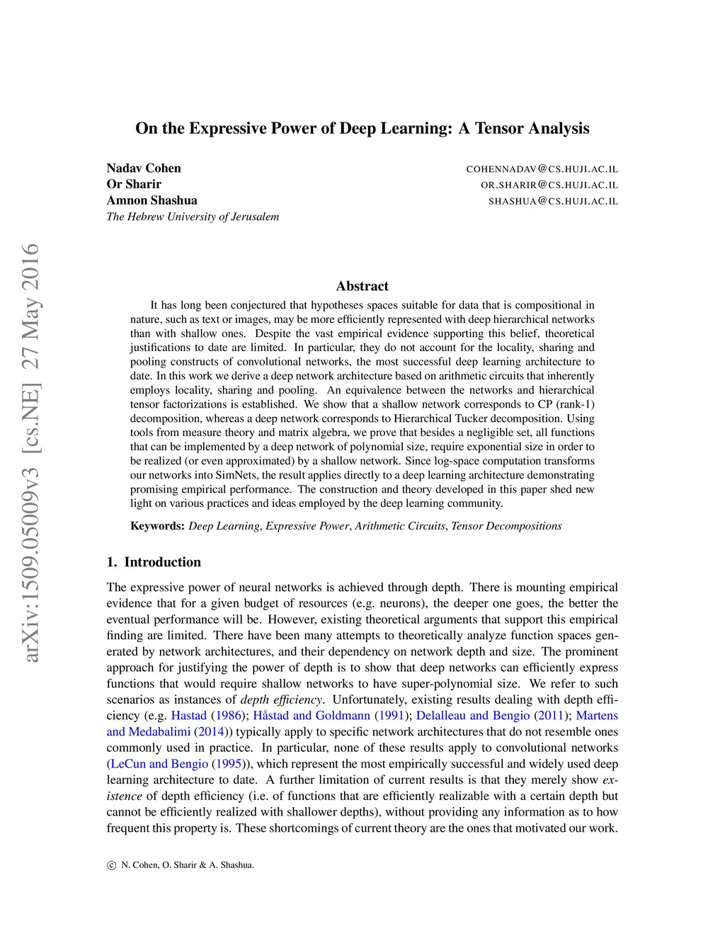 It has long been conjectured that hypotheses spaces suitable for data that is compositional in nature, such as text or images, may be more efficiently represented with deep hierarchical networks than with shallow ones. Despite the vast empirical evidence supporting this belief, theoretical justifications to date are limited. In particular, they do not account for the locality, sharing and pooling constructs of convolutional networks, the most successful deep learning architecture to date. In this work we derive a deep network architecture based on arithmetic circuits that inherently employs locality, sharing and pooling. An equivalence between the networks and hierarchical tensor factorizations is established. We show that a shallow network corresponds to CP (rank-1) decomposition, whereas a deep network corresponds to Hierarchical Tucker decomposition. Using tools from measure theory and matrix algebra, we prove that besides a negligible set, all functions that can be implemented by a deep network of polynomial size, require exponential size in order to be realized (or even approximated) by a shallow network. Since log-space computation transforms our networks into SimNets, the result applies directly to a deep learning architecture demonstrating promising empirical performance. The construction and theory developed in this paper shed new light on various practices and ideas employed by the deep learning community.