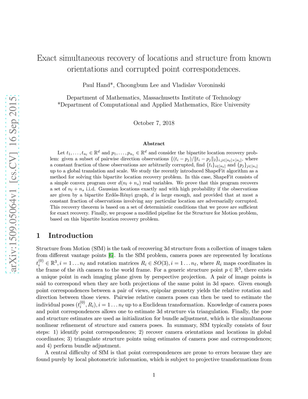 Let and and consider the bipartite location recovery problem: given a subset of pairwise direction observations , where a constant fraction of these observations are arbitrarily corrupted, find and up to a global translation and scale. We study the recently introduced ShapeFit algorithm as a method for solving this bipartite location recovery problem. In this case, ShapeFit consists of a simple convex program over real variables. We prove that this program recovers a set of i.i.d. Gaussian locations exactly and with high probability if the observations are given by a bipartite Erd\H{o}s-R\'{e}nyi graph, is large enough, and provided that at most a constant fraction of observations involving any particular location are adversarially corrupted. This recovery theorem is based on a set of deterministic conditions that we prove are sufficient for exact recovery. Finally, we propose a modified pipeline for the Structure for Motion problem, based on this bipartite location recovery problem.