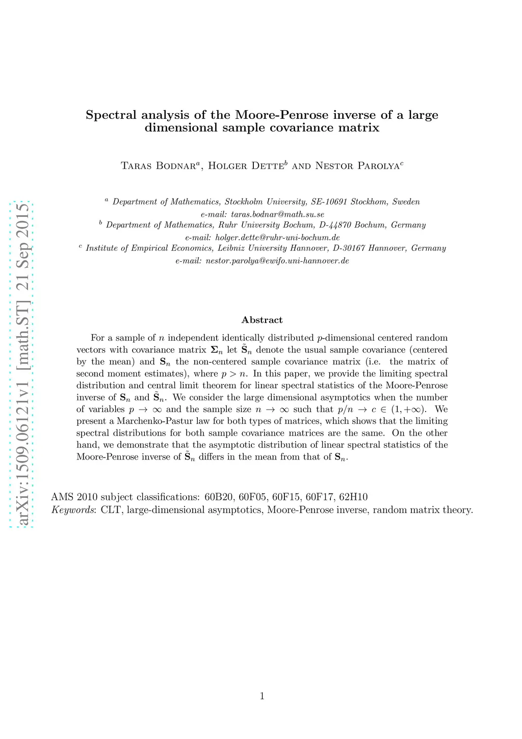 For a sample of independent identically distributed -dimensional centered random vectors with covariance matrix let denote the usual sample covariance (centered by the mean) and the non-centered sample covariance matrix (i.e. the matrix of second moment estimates), where . In this paper, we provide the limiting spectral distribution and central limit theorem for linear spectral statistics of the Moore-Penrose inverse of and . We consider the large dimensional asymptotics when the number of variables and the sample size such that . We present a Marchenko-Pastur law for both types of matrices, which shows that the limiting spectral distributions for both sample covariance matrices are the same. On the other hand, we demonstrate that the asymptotic distribution of linear spectral statistics of the Moore-Penrose inverse of differs in the mean from that of .