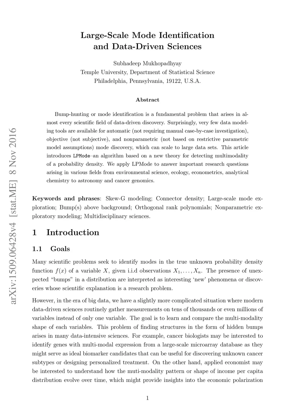 Bump-hunting or mode identification is a fundamental problem that arises in almost every scientific field of data-driven discovery. Surprisingly, very few data modeling tools are available for automatic (not requiring manual case-by-base investigation), objective (not subjective), and nonparametric (not based on restrictive parametric model assumptions) mode discovery, which can scale to large data sets. This article introduces LPMode--an algorithm based on a new theory for detecting multimodality of a probability density. We apply LPMode to answer important research questions arising in various fields from environmental science, ecology, econometrics, analytical chemistry to astronomy and cancer genomics.