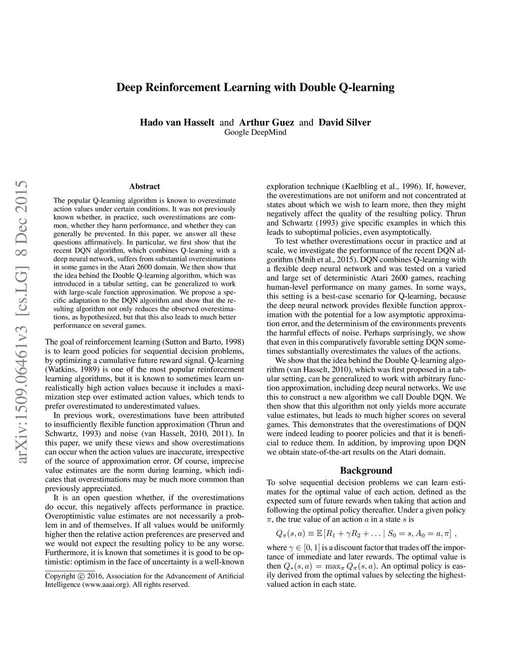 The popular Q-learning algorithm is known to overestimate action values under certain conditions. It was not previously known whether, in practice, such overestimations are common, whether they harm performance, and whether they can generally be prevented. In this paper, we answer all these questions affirmatively. In particular, we first show that the recent DQN algorithm, which combines Q-learning with a deep neural network, suffers from substantial overestimations in some games in the Atari 2600 domain. We then show that the idea behind the Double Q-learning algorithm, which was introduced in a tabular setting, can be generalized to work with large-scale function approximation. We propose a specific adaptation to the DQN algorithm and show that the resulting algorithm not only reduces the observed overestimations, as hypothesized, but that this also leads to much better performance on several games.