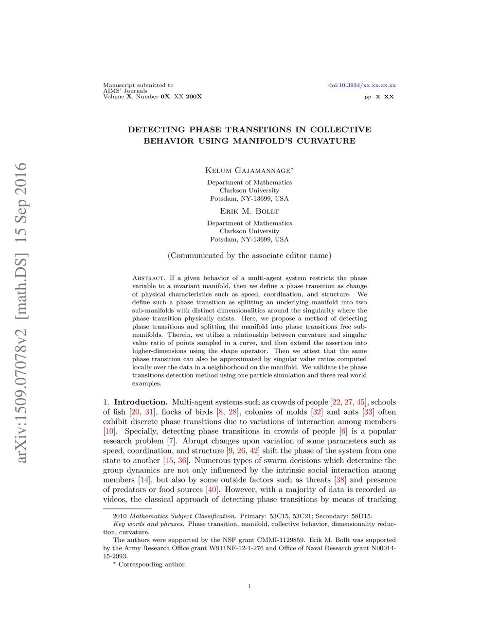 If a given behavior of a multi-agent system restricts the phase variable to a invariant manifold, then we define a phase transition as change of physical characteristics such as speed, coordination, and structure. We define such a phase transition as splitting an underlying manifold into two sub-manifolds with distinct dimensionalities around the singularity where the phase transition physically exists. Here, we propose a method of detecting phase transitions and splitting the manifold into phase transitions free sub-manifolds. Therein, we utilize a relationship between curvature and singular value ratio of points sampled in a curve, and then extend the assertion into higher-dimensions using the shape operator. Then we attest that the same phase transition can also be approximated by singular value ratios computed locally over the data in a neighborhood on the manifold. We validate the phase transitions detection method using one particle simulation and three real world examples.