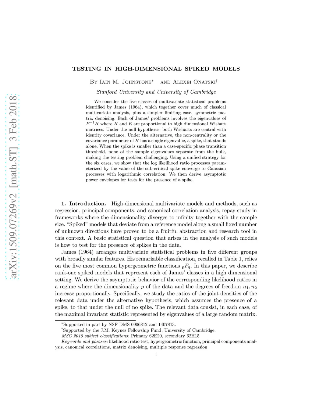 We consider the five classes of multivariate statistical problems identified by James (1964), which together cover much of classical multivariate analysis, plus a simpler limiting case, symmetric matrix denoising. Each of James' problems involves the eigenvalues of where and are proportional to high dimensional Wishart matrices. Under the null hypothesis, both Wisharts are central with identity covariance. Under the alternative, the non-centrality or the covariance parameter of has a single eigenvalue, a spike, that stands alone. When the spike is smaller than a case-specific phase transition threshold, none of the sample eigenvalues separate from the bulk, making the testing problem challenging. Using a unified strategy for the six cases, we show that the log likelihood ratio processes parameterized by the value of the sub-critical spike converge to Gaussian processes with logarithmic correlation. We then derive asymptotic power envelopes for tests for the presence of a spike.
