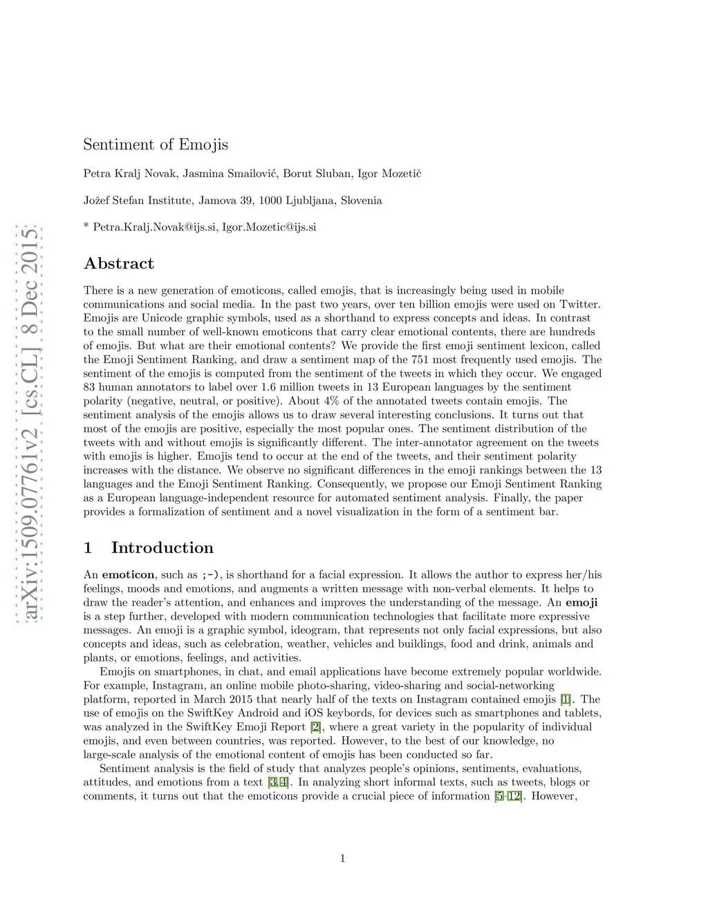 There is a new generation of emoticons, called emojis, that is increasingly being used in mobile communications and social media. In the past two years, over ten billion emojis were used on Twitter. Emojis are Unicode graphic symbols, used as a shorthand to express concepts and ideas. In contrast to the small number of well-known emoticons that carry clear emotional contents, there are hundreds of emojis. But what are their emotional contents? We provide the first emoji sentiment lexicon, called the Emoji Sentiment Ranking, and draw a sentiment map of the 751 most frequently used emojis. The sentiment of the emojis is computed from the sentiment of the tweets in which they occur. We engaged 83 human annotators to label over 1.6 million tweets in 13 European languages by the sentiment polarity (negative, neutral, or positive). About 4% of the annotated tweets contain emojis. The sentiment analysis of the emojis allows us to draw several interesting conclusions. It turns out that most of the emojis are positive, especially the most popular ones. The sentiment distribution of the tweets with and without emojis is significantly different. The inter-annotator agreement on the tweets with emojis is higher. Emojis tend to occur at the end of the tweets, and their sentiment polarity increases with the distance. We observe no significant differences in the emoji rankings between the 13 languages and the Emoji Sentiment Ranking. Consequently, we propose our Emoji Sentiment Ranking as a European language-independent resource for automated sentiment analysis. Finally, the paper provides a formalization of sentiment and a novel visualization in the form of a sentiment bar.