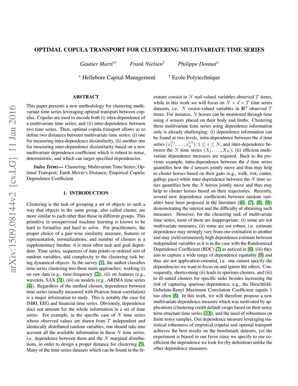 This paper presents a new methodology for clustering multivariate time series leveraging optimal transport between copulas. Copulas are used to encode both (i) intra-dependence of a multivariate time series, and (ii) inter-dependence between two time series. Then, optimal copula transport allows us to define two distances between multivariate time series: (i) one for measuring intra-dependence dissimilarity, (ii) another one for measuring inter-dependence dissimilarity based on a new multivariate dependence coefficient which is robust to noise, deterministic, and which can target specified dependencies.