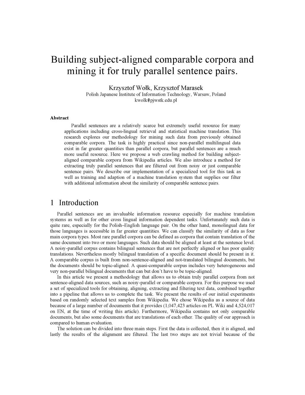 Parallel sentences are a relatively scarce but extremely useful resource for many applications including cross-lingual retrieval and statistical machine translation. This research explores our methodology for mining such data from previously obtained comparable corpora. The task is highly practical since non-parallel multilingual data exist in far greater quantities than parallel corpora, but parallel sentences are a much more useful resource. Here we propose a web crawling method for building subject-aligned comparable corpora from Wikipedia articles. We also introduce a method for extracting truly parallel sentences that are filtered out from noisy or just comparable sentence pairs. We describe our implementation of a specialized tool for this task as well as training and adaption of a machine translation system that supplies our filter with additional information about the similarity of comparable sentence pairs.