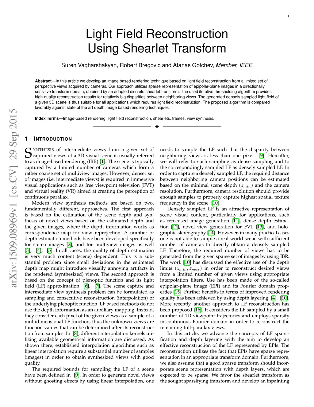In this article we develop an image based rendering technique based on light field reconstruction from a limited set of perspective views acquired by cameras. Our approach utilizes sparse representation of epipolar-plane images in a directionally sensitive transform domain, obtained by an adapted discrete shearlet transform. The used iterative thresholding algorithm provides high-quality reconstruction results for relatively big disparities between neighboring views. The generated densely sampled light field of a given 3D scene is thus suitable for all applications which requires light field reconstruction. The proposed algorithm is compared favorably against state of the art depth image based rendering techniques.