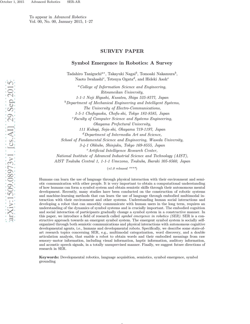 Humans can learn the use of language through physical interaction with their environment and semiotic communication with other people. It is very important to obtain a computational understanding of how humans can form a symbol system and obtain semiotic skills through their autonomous mental development. Recently, many studies have been conducted on the construction of robotic systems and machine-learning methods that can learn the use of language through embodied multimodal interaction with their environment and other systems. Understanding human social interactions and developing a robot that can smoothly communicate with human users in the long term, requires an understanding of the dynamics of symbol systems and is crucially important. The embodied cognition and social interaction of participants gradually change a symbol system in a constructive manner. In this paper, we introduce a field of research called symbol emergence in robotics (SER). SER is a constructive approach towards an emergent symbol system. The emergent symbol system is socially self-organized through both semiotic communications and physical interactions with autonomous cognitive developmental agents, i.e., humans and developmental robots. Specifically, we describe some state-of-art research topics concerning SER, e.g., multimodal categorization, word discovery, and a double articulation analysis, that enable a robot to obtain words and their embodied meanings from raw sensory--motor information, including visual information, haptic information, auditory information, and acoustic speech signals, in a totally unsupervised manner. Finally, we suggest future directions of research in SER.