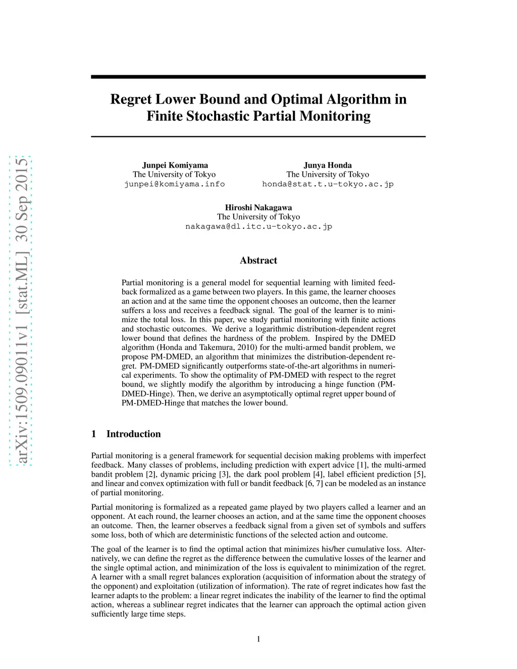 Regret Lower Bound and Optimal Algorithm in Finite Stochastic Partial