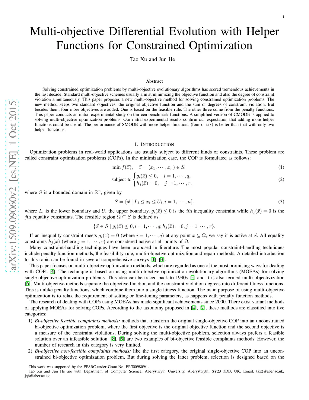 Solving constrained optimization problems by multi-objective evolutionary algorithms has scored tremendous achievements in the last decade. Standard multi-objective schemes usually aim at minimizing the objective function and also the degree of constraint violation simultaneously. This paper proposes a new multi-objective method for solving constrained optimization problems. The new method keeps two standard objectives: the original objective function and the sum of degrees of constraint violation. But besides them, four more objectives are added. One is based on the feasible rule. The other three come from the penalty functions. This paper conducts an initial experimental study on thirteen benchmark functions. A simplified version of CMODE is applied to solving multi-objective optimization problems. Our initial experimental results confirm our expectation that adding more helper functions could be useful. The performance of SMODE with more helper functions (four or six) is better than that with only two helper functions.