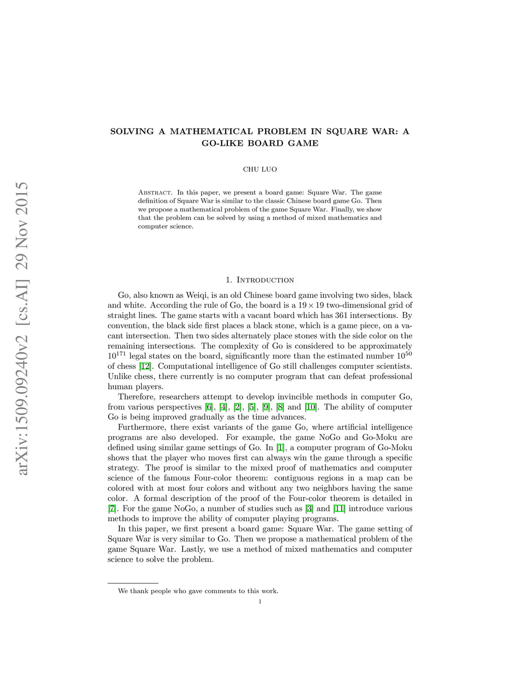 In this paper, we present a board game: Square War. The game definition of Square War is similar to the classic Chinese board game Go. Then we propose a mathematical problem of the game Square War. Finally, we show that the problem can be solved by using a method of mixed mathematics and computer science.
