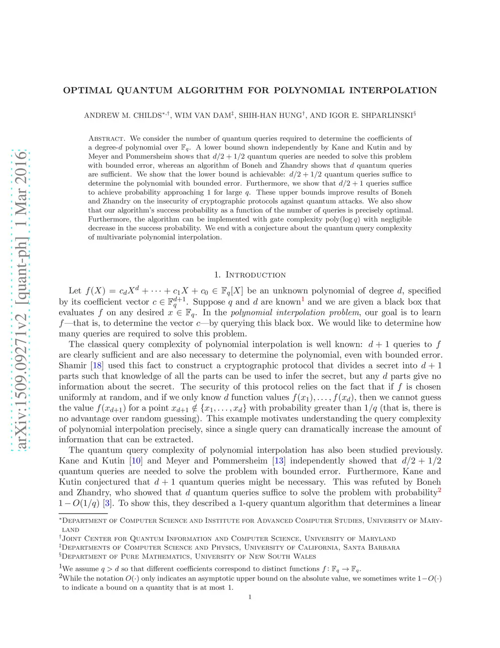 We consider the number of quantum queries required to determine the coefficients of a degree-d polynomial over GF(q). A lower bound shown independently by Kane and Kutin and by Meyer and Pommersheim shows that d/2+1/2 quantum queries are needed to solve this problem with bounded error, whereas an algorithm of Boneh and Zhandry shows that d quantum queries are sufficient. We show that the lower bound is achievable: d/2+1/2 quantum queries suffice to determine the polynomial with bounded error. Furthermore, we show that d/2+1 queries suffice to achieve probability approaching 1 for large q. These upper bounds improve results of Boneh and Zhandry on the insecurity of cryptographic protocols against quantum attacks. We also show that our algorithm's success probability as a function of the number of queries is precisely optimal. Furthermore, the algorithm can be implemented with gate complexity poly(log q) with negligible decrease in the success probability. We end with a conjecture about the quantum query complexity of multivariate polynomial interpolation.