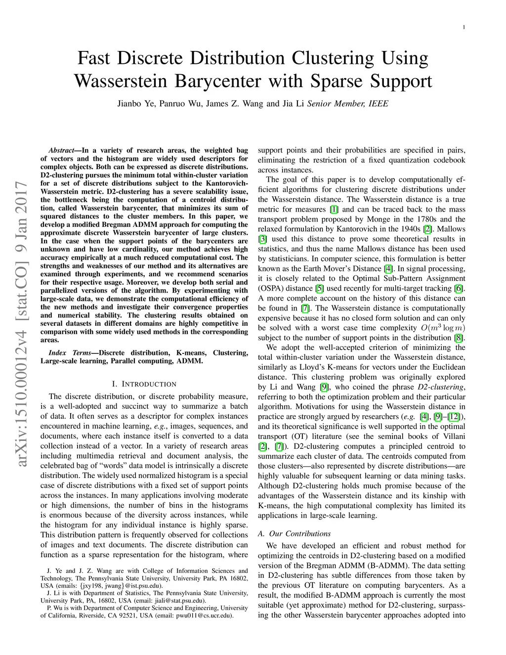 In a variety of research areas, the weighted bag of vectors and the histogram are widely used descriptors for complex objects. Both can be expressed as discrete distributions. D2-clustering pursues the minimum total within-cluster variation for a set of discrete distributions subject to the Kantorovich-Wasserstein metric. D2-clustering has a severe scalability issue, the bottleneck being the computation of a centroid distribution, called Wasserstein barycenter, that minimizes its sum of squared distances to the cluster members. In this paper, we develop a modified Bregman ADMM approach for computing the approximate discrete Wasserstein barycenter of large clusters. In the case when the support points of the barycenters are unknown and have low cardinality, our method achieves high accuracy empirically at a much reduced computational cost. The strengths and weaknesses of our method and its alternatives are examined through experiments, and we recommend scenarios for their respective usage. Moreover, we develop both serial and parallelized versions of the algorithm. By experimenting with large-scale data, we demonstrate the computational efficiency of the new methods and investigate their convergence properties and numerical stability. The clustering results obtained on several datasets in different domains are highly competitive in comparison with some widely used methods in the corresponding areas.