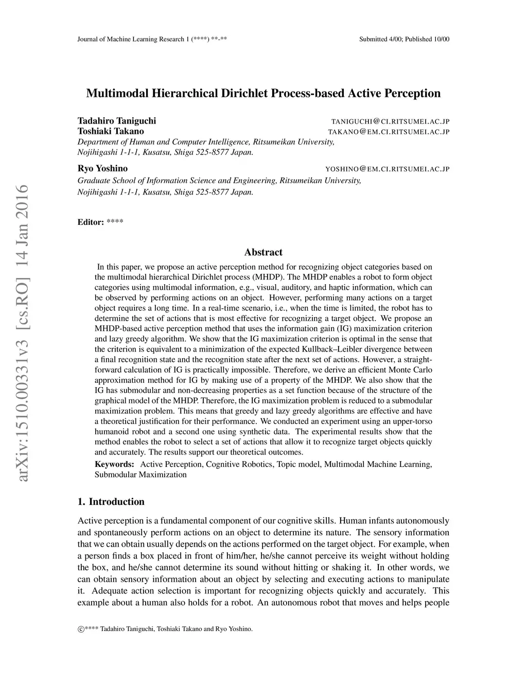 Multimodal Hierarchical Dirichlet Process-based Active Perception