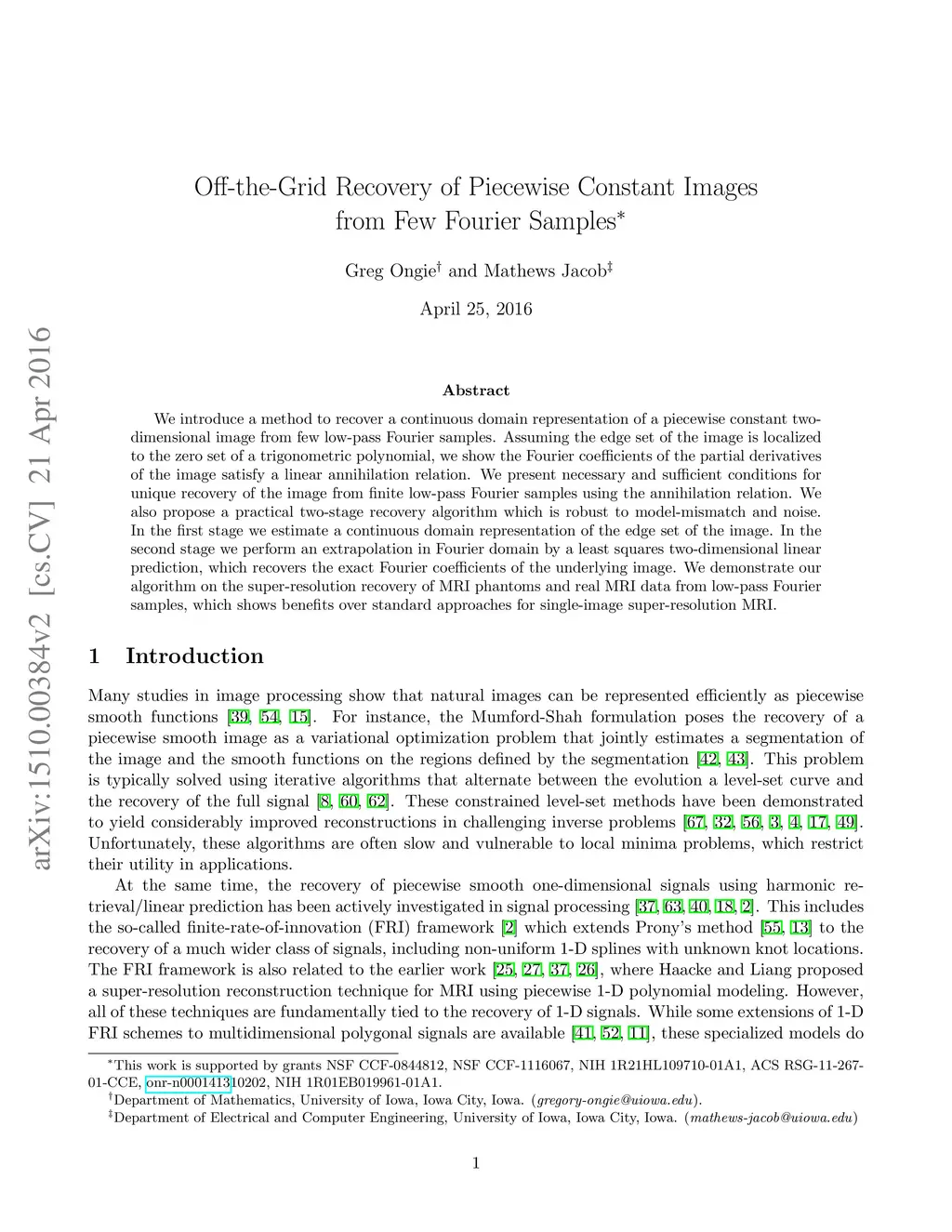 We introduce a method to recover a continuous domain representation of a piecewise constant two-dimensional image from few low-pass Fourier samples. Assuming the edge set of the image is localized to the zero set of a trigonometric polynomial, we show the Fourier coefficients of the partial derivatives of the image satisfy a linear annihilation relation. We present necessary and sufficient conditions for unique recovery of the image from finite low-pass Fourier samples using the annihilation relation. We also propose a practical two-stage recovery algorithm which is robust to model-mismatch and noise. In the first stage we estimate a continuous domain representation of the edge set of the image. In the second stage we perform an extrapolation in Fourier domain by a least squares two-dimensional linear prediction, which recovers the exact Fourier coefficients of the underlying image. We demonstrate our algorithm on the super-resolution recovery of MRI phantoms and real MRI data from low-pass Fourier samples, which shows benefits over standard approaches for single-image super-resolution MRI.