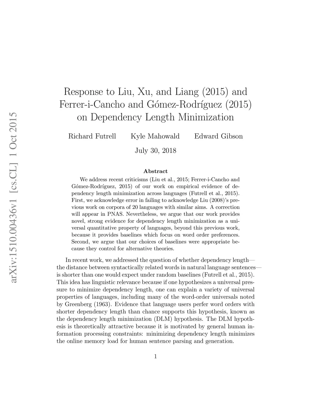 We address recent criticisms (Liu et al., 2015; Ferrer-i-Cancho and G\ómez-Rodr\íguez, 2015) of our work on empirical evidence of dependency length minimization across languages (Futrell et al., 2015). First, we acknowledge error in failing to acknowledge Liu (2008)'s previous work on corpora of 20 languages with similar aims. A correction will appear in PNAS. Nevertheless, we argue that our work provides novel, strong evidence for dependency length minimization as a universal quantitative property of languages, beyond this previous work, because it provides baselines which focus on word order preferences. Second, we argue that our choices of baselines were appropriate because they control for alternative theories.
