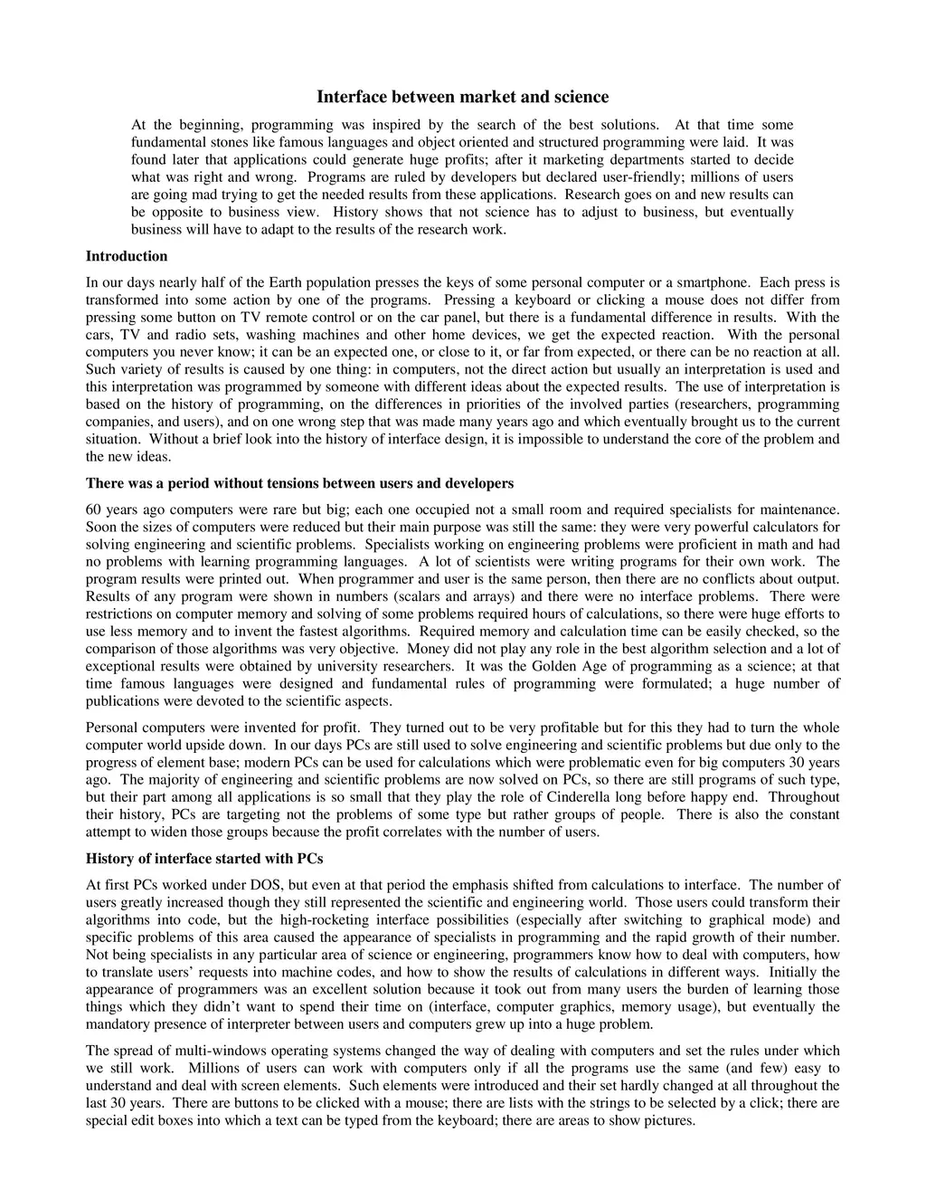 At the beginning, programming was inspired by the search of the best solutions. At that time some fundamental stones like famous languages and object oriented and structured programming were laid. It was found later that applications could generate huge profits; after it marketing departments started to decide what was right and wrong. Programs are ruled by developers but declared user-friendly; millions of users are going mad trying to get the needed results from these applications. Research goes on and new results can be opposite to business view. History shows that not science has to adjust to business, but eventually business will have to adapt to the results of the research work.