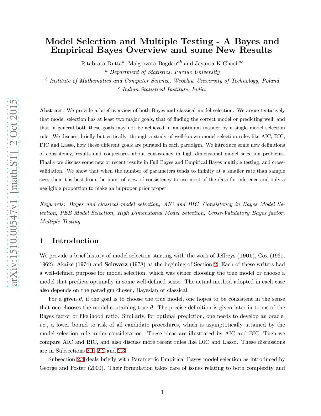 We provide a brief overview of both Bayes and classical model selection. We argue tentatively that model selection has at least two major goals, that of finding the correct model or predicting well, and that in general both these goals may not be achieved in an optimum manner by a single model selection rule. We discuss, briefly but critically, through a study of well-known model selection rules like AIC, BIC, DIC and Lasso, how these different goals are pursued in each paradigm. We introduce some new definitions of consistency, results and conjectures about consistency in high dimensional model selection problems. Finally we discuss some new or recent results in Full Bayes and Empirical Bayes multiple testing, and cross-validation. We show that when the number of parameters tends to infinity at a smaller rate than sample size, then it is best from the point of view of consistency to use most of the data for inference and only a negligible proportion to make an improper prior proper.