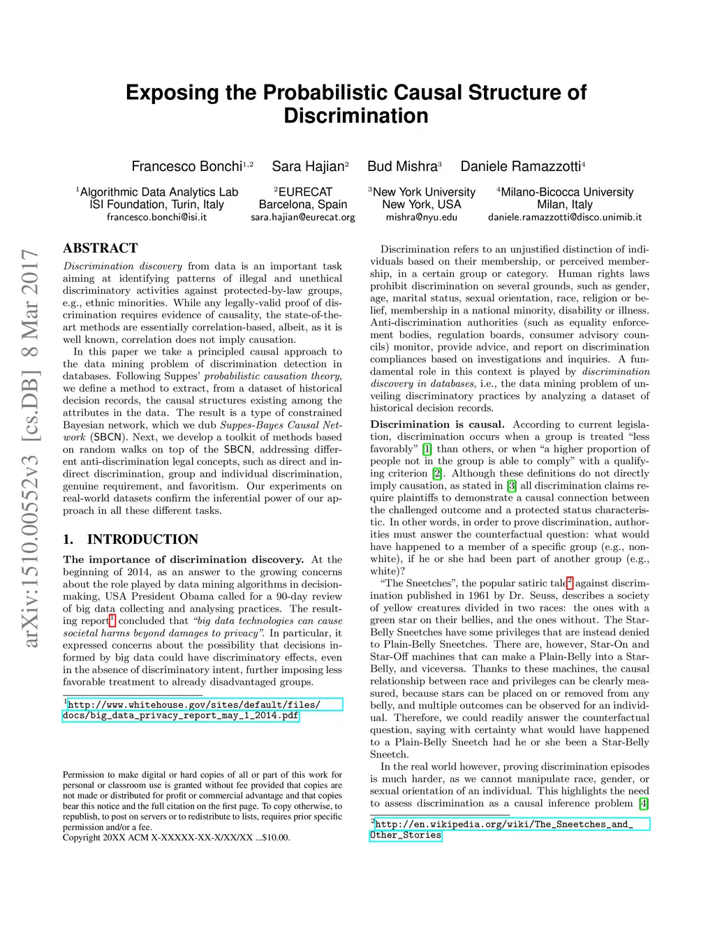 Discrimination discovery from data is an important task aiming at identifying patterns of illegal and unethical discriminatory activities against protected-by-law groups, e.g., ethnic minorities. While any legally-valid proof of discrimination requires evidence of causality, the state-of-the-art methods are essentially correlation-based, albeit, as it is well known, correlation does not imply causation. In this paper we take a principled causal approach to the data mining problem of discrimination detection in databases. Following Suppes' probabilistic causation theory, we define a method to extract, from a dataset of historical decision records, the causal structures existing among the attributes in the data. The result is a type of constrained Bayesian network, which we dub Suppes-Bayes Causal Network (SBCN). Next, we develop a toolkit of methods based on random walks on top of the SBCN, addressing different anti-discrimination legal concepts, such as direct and indirect discrimination, group and individual discrimination, genuine requirement, and favoritism. Our experiments on real-world datasets confirm the inferential power of our approach in all these different tasks.