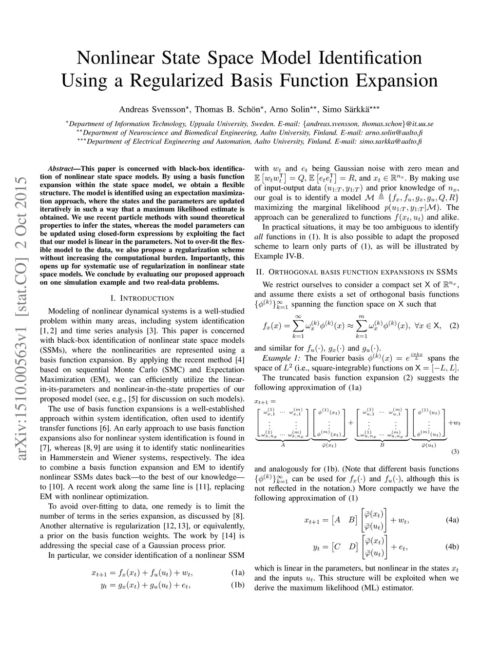 This paper is concerned with black-box identification of nonlinear state space models. By using a basis function expansion within the state space model, we obtain a flexible structure. The model is identified using an expectation maximization approach, where the states and the parameters are updated iteratively in such a way that a maximum likelihood estimate is obtained. We use recent particle methods with sound theoretical properties to infer the states, whereas the model parameters can be updated using closed-form expressions by exploiting the fact that our model is linear in the parameters. Not to over-fit the flexible model to the data, we also propose a regularization scheme without increasing the computational burden. Importantly, this opens up for systematic use of regularization in nonlinear state space models. We conclude by evaluating our proposed approach on one simulation example and two real-data problems.