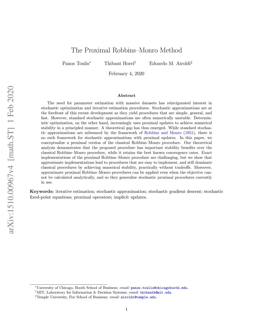 The need for parameter estimation with massive datasets has reinvigorated interest in stochastic optimization and iterative estimation procedures. Stochastic approximations are at the forefront of this recent development as they yield procedures that are simple, general, and fast. However, standard stochastic approximations are often numerically unstable. Deterministic optimization, on the other hand, increasingly uses proximal updates to achieve numerical stability in a principled manner. A theoretical gap has thus emerged. While standard stochastic approximations are subsumed by the framework of Robbins and Monro (1951), there is no such framework for stochastic approximations with proximal updates. In this paper, we conceptualize a proximal version of the classical Robbins-Monro procedure. Our theoretical analysis demonstrates that the proposed procedure has important stability benefits over the classical Robbins-Monro procedure, while it retains the best known convergence rates. Exact implementations of the proximal Robbins-Monro procedure are challenging, but we show that approximate implementations lead to procedures that are easy to implement, and still dominate classical procedures by achieving numerical stability, practically without tradeoffs. Moreover, approximate proximal Robbins-Monro procedures can be applied even when the objective cannot be calculated analytically, and so they generalize stochastic proximal procedures currently in use.
