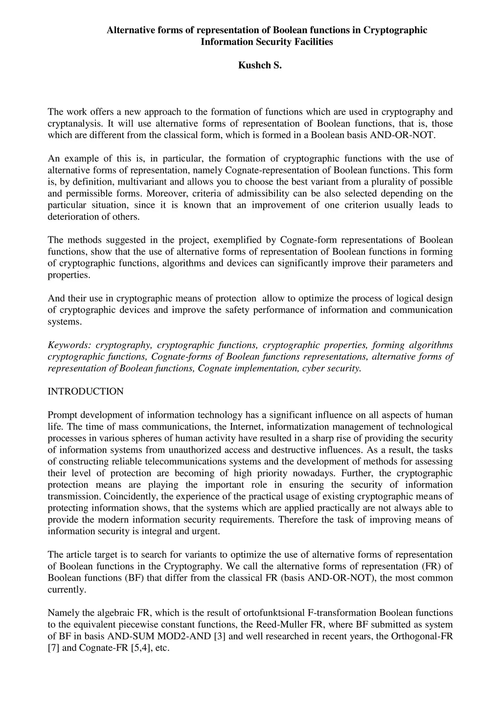 The work offers a new approach to the formation of functions which are used in cryptography and cryptanalysis. It will use alternative forms of representation of Boolean functions, that is, those which are different from the classical form, which is formed in a Boolean basis AND-OR-NOT. An example of this is, in particular, the formation of cryptographic functions with the use of alternative forms of representation, namely Cognate-representation of Boolean functions. This form is, by definition, multivariant and allows you to choose the best variant from a plurality of possible and permissible forms. Moreover, criteria of admissibility can be also selected depending on the particular situation, since it is known that an improvement of one criterion usually leads to deterioration of others. The methods suggested in the project, exemplified by Cognate-form representations of Boolean functions, show that the use of alternative forms of representation of Boolean functions in forming of cryptographic functions, algorithms and devices can significantly improve their parameters and properties. And their use in cryptographic means of protection allow to optimize the process of logical design of cryptographic devices and improve the safety performance of information and communication systems.