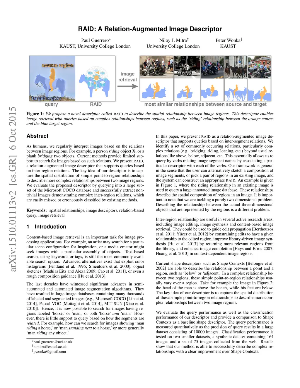 As humans, we regularly interpret images based on the relations between image regions. For example, a person riding object X, or a plank bridging two objects. Current methods provide limited support to search for images based on such relations. We present RAID, a relation-augmented image descriptor that supports queries based on inter-region relations. The key idea of our descriptor is to capture the spatial distribution of simple point-to-region relationships to describe more complex relationships between two image regions. We evaluate the proposed descriptor by querying into a large subset of the Microsoft COCO database and successfully extract nontrivial images demonstrating complex inter-region relations, which are easily missed or erroneously classified by existing methods.
