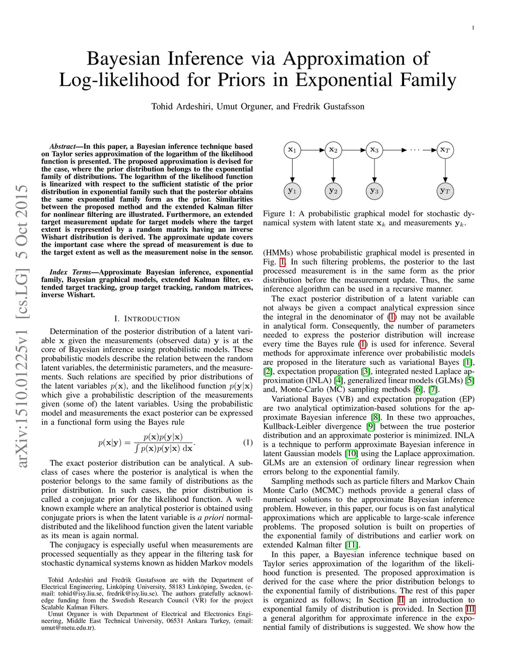 In this paper, a Bayesian inference technique based on Taylor series approximation of the logarithm of the likelihood function is presented. The proposed approximation is devised for the case, where the prior distribution belongs to the exponential family of distributions. The logarithm of the likelihood function is linearized with respect to the sufficient statistic of the prior distribution in exponential family such that the posterior obtains the same exponential family form as the prior. Similarities between the proposed method and the extended Kalman filter for nonlinear filtering are illustrated. Furthermore, an extended target measurement update for target models where the target extent is represented by a random matrix having an inverse Wishart distribution is derived. The approximate update covers the important case where the spread of measurement is due to the target extent as well as the measurement noise in the sensor.