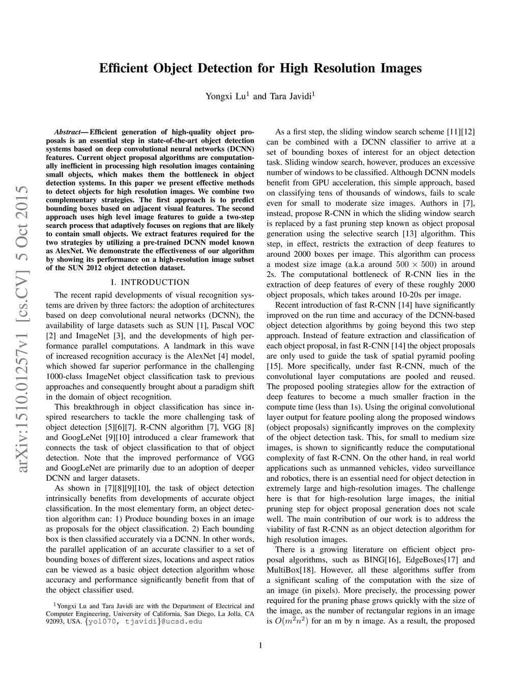 Efficient generation of high-quality object proposals is an essential step in state-of-the-art object detection systems based on deep convolutional neural networks (DCNN) features. Current object proposal algorithms are computationally inefficient in processing high resolution images containing small objects, which makes them the bottleneck in object detection systems. In this paper we present effective methods to detect objects for high resolution images. We combine two complementary strategies. The first approach is to predict bounding boxes based on adjacent visual features. The second approach uses high level image features to guide a two-step search process that adaptively focuses on regions that are likely to contain small objects. We extract features required for the two strategies by utilizing a pre-trained DCNN model known as AlexNet. We demonstrate the effectiveness of our algorithm by showing its performance on a high-resolution image subset of the SUN 2012 object detection dataset.