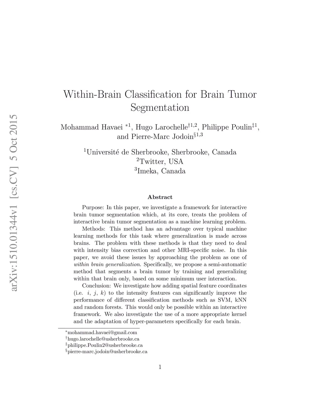 Purpose: In this paper, we investigate a framework for interactive brain tumor segmentation which, at its core, treats the problem of interactive brain tumor segmentation as a machine learning problem. Methods: This method has an advantage over typical machine learning methods for this task where generalization is made across brains. The problem with these methods is that they need to deal with intensity bias correction and other MRI-specific noise. In this paper, we avoid these issues by approaching the problem as one of within brain generalization. Specifically, we propose a semi-automatic method that segments a brain tumor by training and generalizing within that brain only, based on some minimum user interaction. Conclusion: We investigate how adding spatial feature coordinates (i.e. , , ) to the intensity features can significantly improve the performance of different classification methods such as SVM, kNN and random forests. This would only be possible within an interactive framework. We also investigate the use of a more appropriate kernel and the adaptation of hyper-parameters specifically for each brain. Results: As a result of these experiments, we obtain an interactive method whose results reported on the MICCAI-BRATS 2013 dataset are the second most accurate compared to published methods, while using significantly less memory and processing power than most state-of-the-art methods.