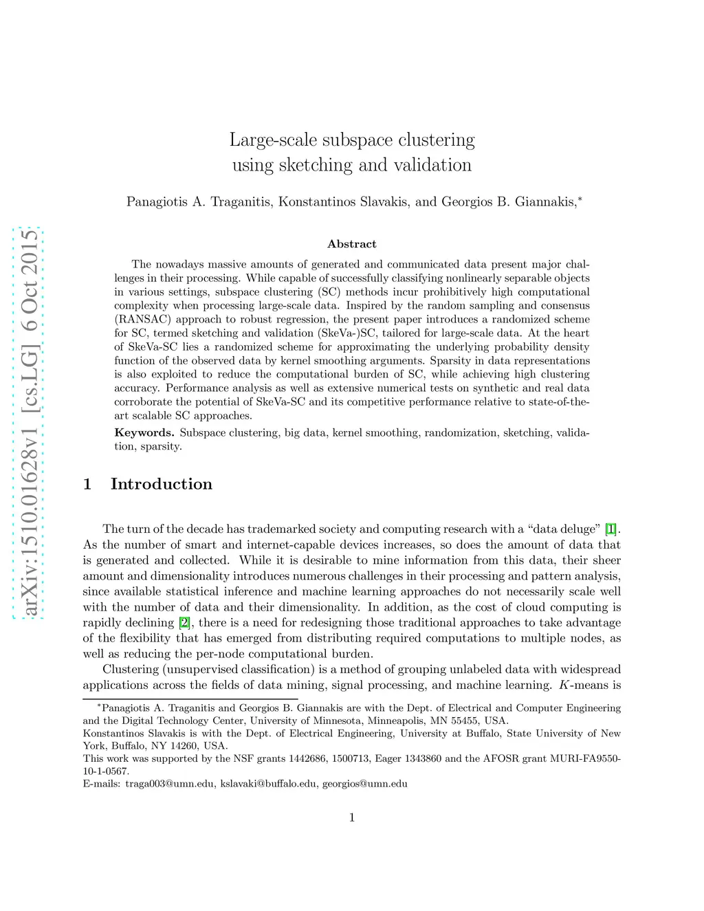 The nowadays massive amounts of generated and communicated data present major challenges in their processing. While capable of successfully classifying nonlinearly separable objects in various settings, subspace clustering (SC) methods incur prohibitively high computational complexity when processing large-scale data. Inspired by the random sampling and consensus (RANSAC) approach to robust regression, the present paper introduces a randomized scheme for SC, termed sketching and validation (SkeVa-)SC, tailored for large-scale data. At the heart of SkeVa-SC lies a randomized scheme for approximating the underlying probability density function of the observed data by kernel smoothing arguments. Sparsity in data representations is also exploited to reduce the computational burden of SC, while achieving high clustering accuracy. Performance analysis as well as extensive numerical tests on synthetic and real data corroborate the potential of SkeVa-SC and its competitive performance relative to state-of-the-art scalable SC approaches. Keywords: Subspace clustering, big data, kernel smoothing, randomization, sketching, validation, sparsity.