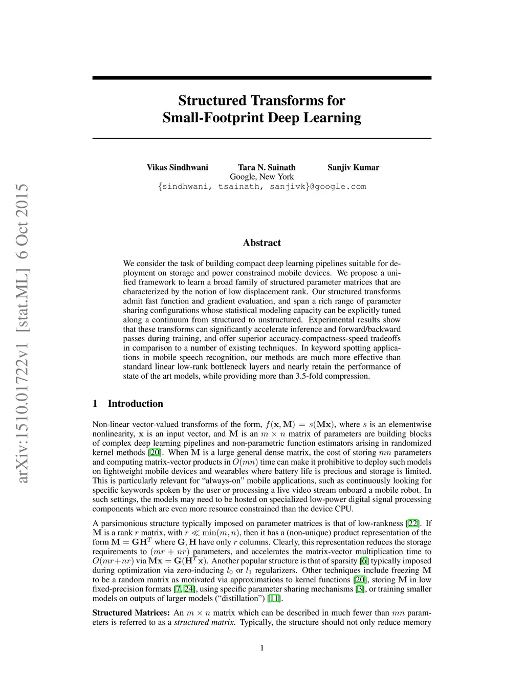 We consider the task of building compact deep learning pipelines suitable for deployment on storage and power constrained mobile devices. We propose a unified framework to learn a broad family of structured parameter matrices that are characterized by the notion of low displacement rank. Our structured transforms admit fast function and gradient evaluation, and span a rich range of parameter sharing configurations whose statistical modeling capacity can be explicitly tuned along a continuum from structured to unstructured. Experimental results show that these transforms can significantly accelerate inference and forward/backward passes during training, and offer superior accuracy-compactness-speed tradeoffs in comparison to a number of existing techniques. In keyword spotting applications in mobile speech recognition, our methods are much more effective than standard linear low-rank bottleneck layers and nearly retain the performance of state of the art models, while providing more than 3.5-fold compression.