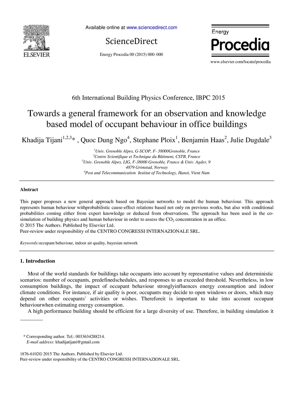 This paper proposes a new general approach based on Bayesian networks to model the human behaviour. This approach represents human behaviour withprobabilistic cause-effect relations based not only on previous works, but also with conditional probabilities coming either from expert knowledge or deduced from observations. The approach has been used in the co-simulation of building physics and human behaviour in order to assess the CO 2 concentration in an office.